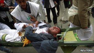 A medic helps an injured anti-government protester in Sanaa (18 March 2011). Doctors said that most of the injuries were to the neck, head and chest of protesters