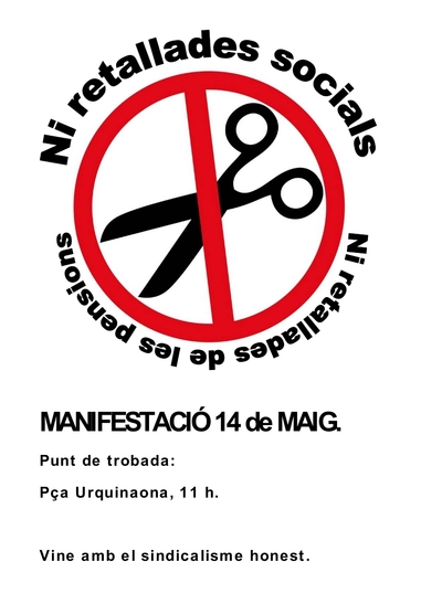 La CGT de Catalunya juntament amb la CNT-AIT i la COS, moviments socials, assemblees de treballadors i de barri, crida a la ciutadania a manifestar-se el 14 de maig amb el sindicalisme que no es ven en contra les retallades socials, als serveis públics i a les pensions.