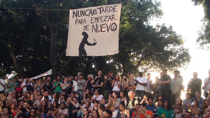 Today I have heard of at least four new squares being occupied in different barrios (districts) of the city, with street assemblies of up to 800 people in Santa Coloma. There have also been outbreaks of ‘pot banging’ in inner city areas with people of all ages joining in. The central square of Plaza Catalunya is becoming a tent city, well organised with every imaginable activity and incredible adrenalin. When 3000 demonstrating students arrived this afternoon they couldn´t physically fit in and the whole thing began ballooning out, while being photographed by stacks of tourists.