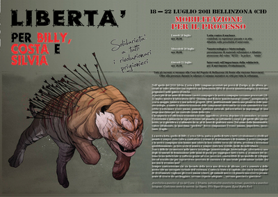 Nuestra lucha, la de Billy, Costa y Silvia, junto a la de todas y todos los revolucionarios y rebeldes del mundo siempre ha sido combatir contra el sistema de explotación y dominio. Nuestros compañeros y nuestra compañera nunca han ocultado su hostilidad hacia el que explota, envenena y aterroriza cotidianamente. El enemigo siempre ha sido visible a sus ojos, fácil de descubrir. Estos encuentros serán en la Casa del Pueblo de Bellinzona (frente a la estación de tren). Además de la presencia en la Audencia, durante toda la semana se desarrollarán distintas iniciativas en la ciudad. http://barcelona.indymedia.org/newswire/display/425734/index.php |