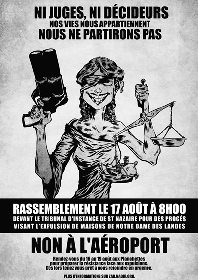 The occupiers of the ZAD were facing court last week as the authorities began the eviction process against the anti-airport community. The ZAD -Zone d’Aménagement Differé (dubbed the Zone A Defendre by the activists) is an area of 6 square miles in the French countryside near Nantes due to be flattened in order to make way for a new international airport, high-speed train and motorway (see SchNEWS 750).