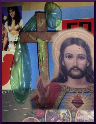 …In the exhibition Jesus Christ, nailed on the cross, has a penis covered by a bright red condom.... posters of Mother Mary and Jesus Christ mixed with images of Mickey Mouse, US President Barack