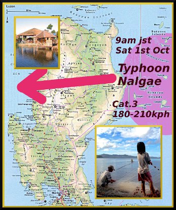 Latest: Nalgae is strengthening phenomenally due to temperatures of 30C in The Phillipine Sea. Some reports estimate it will strike Luzon as a Category 4 Hurricane, with winds to 250kph. Some predict it will then swerve North, sparing Vietnam, but threatening Hong Kong