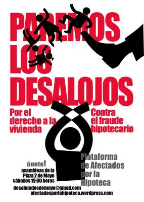 The movement has so far blocked more than 65 evictions, although an average of 175 evictions a day were carried out in Spain in the first quarter of 2011 as a result of the real estate bust. Due to the economic crisis, thousands of people have failed to keep up on their mortgage payments and have been forced out of their homes under a law “that shamefully protects banks and leaves citizens completely defenceless.