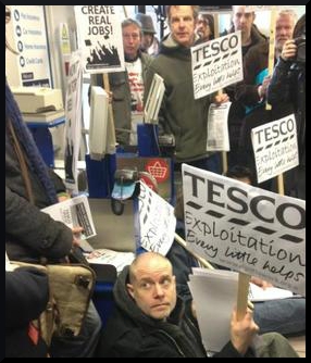 Right to Work and unemployed activists and supporters occupied Westminster Tesco on Saturday. Police issued warning over trespass and refused to answer why they weren’t arresting Tesco bosses for breaching minimum wage legislation. Defiant protesters demanded that Tesco withdraw immediately from all government schemes that force slave labour on the disabled and unemployed chanting: Tesco bosses hear us say, we won’t work if you won’t pay. And ‘first they stole our ema, now they want to steal our pay’.