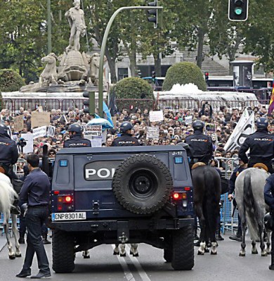 Lo más destacado de esta jornada de marchas y concentraciones es el dispositivo policial desplegado, con más de 1.300 policías y decenas de furgonetas de antidisturbios custodiando la zona. El dispositivo ha sido, de hecho, motivo de polémica y debate después de que la secretaria general del PP, Dolores de Cospedal, lo justificara comparando la convocatoria con el golpe de Estado del 23-F. El blindaje del Congreso es, en cualquier caso, evidente, hasta el punto de que el secretario general del grupo socialista, Eduardo Madina, lo ha considerado “excesivo”, explicando que “yo no siento una amenaza equivalente a 1.300 policías y a una estética de aislamiento del Congreso de todos los españoles”. El Parlamento lleva días custodiado pero esta mañana, desde las 10, la Policía Nacional ha mantenido cortados los accesos, así como el tráfico de vehículos en la Carrera de San Jerónimo y calles colindantes. Decenas de furgones de la Policía se apostaban en puntos estratégicos y un doble vallado de seguridad para blindar también las calles cercanas.