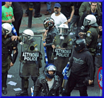 Greek police and Golden dawn neo Nazis with their blue and white flags rolled), photographed before attacking ‘immigrants’, i.e. anyone with a darker skin.