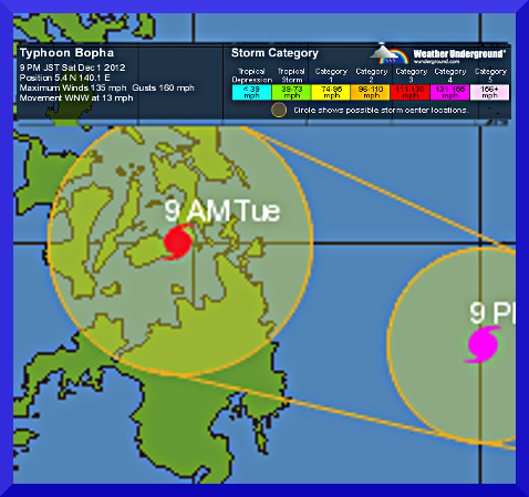 Important Note: Typhoon Bopha (Pablo) is almost three times the strength of Tropical Storm Washi (Sendong) which crossed North-Central Mindanao on December 16, 2011. Please take all precautionary measures on this dangerous cyclone. Refer to your national disaster agencies for more details.