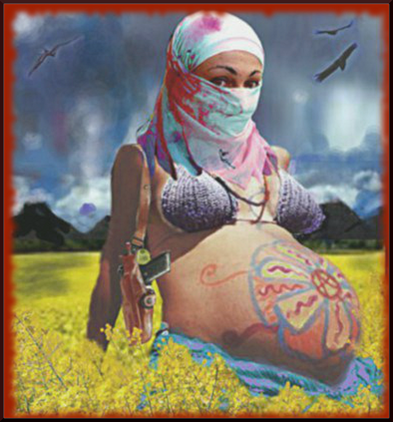Wearing purple denim bands. A beautiful smiling sun on her huge round belly, grinning from ear to ear and drumming her fingers on it, in time to the atrocious music.