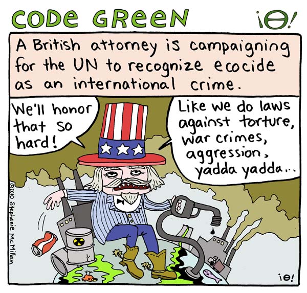 PH: The law of ecocide goes into the heart of the matter. It starts with the premise of first do no harm. It’s like turning the tap off, upstream. At the moment it is the norm for investment to flow toward making profit out of mass damage and destruction. What the law of ecocide is doing is turning off that tap and saying the flow of money can no longer go to dangerous industrial activities. It means that by law the governments will not be able to support those sorts of activities and that by law they would have to prioritize the green economy and innovation in the other direction. So it’s not about closing down the companies.