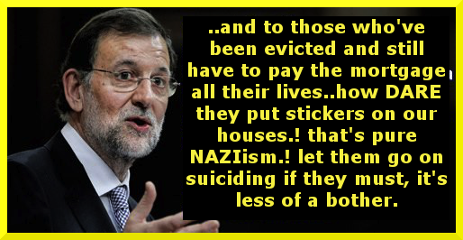 Catalonia’s riot police unleashed the untamed fury of the state upon the protestors and cleared Barcelona’s Plaza Catalunya of all occupants. A dense ring of shell-shocked people gathered around the square. I was one of them. A child riding on his father’s shoulders held up a sign: No soy anti sistema, el sistema es anti yo, it said (I’m not anti-system; the system is anti-me). So writes Don Quijones. Read the rest… Europe’s Stark Choice: Resignation or Revolution17th April 2013. 18 activists fined in record time for demo at corrupt politico’s home under new laws Fines range between 200 and 1,500 euros. The PAH believes that decisions obey a “smokescreen to devirtualize and play down the ILP on evictions that the PP will overthrow this Thursday.” In addition, affected by the mortgages dubbed as “surreal” that “an act criminalizes peaceful protest.”