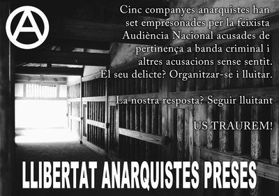 Aquest és el cas de les conegudes com a cinc anarquistes de Barcelona, cinc joves detingudes el 15 de maig en una ràtzia repressiva a Catalunya. L’acusació: pertinença a grup terrorista, enaltiment del terrorisme, captació i adoctrinament i dipòsit de substàncies explosives. Totes i tots ens vàrem quedar sorpresos amb aquestes detencions donat l’espectacle mediàtic que no casava amb cap realitat coneguda. A més, l’espectacle va servir per crear la necessària ”alarma social” que enviàs a aquests jovesa la presó sense cap judici, patint el dur malson de la legislació antiterrorista. Ara, feta la seva feina, els mitjans callen.