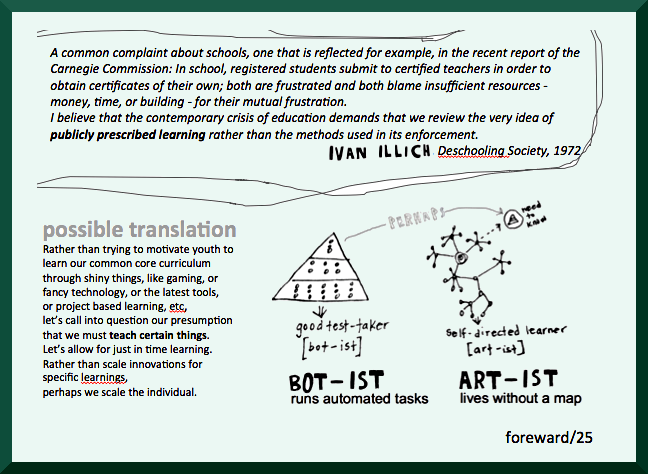 ivan illichThe operation of a peer-matching network would be simple. The user would identify himself by name and address and describe the activity for which he sought a peer. A computer would send him back the names and addresses of all those who had inserted the same description. It is amazing that such a simple utility has never been used on a broad scale for publicly valued activity., i want the kids to learn what they want to learn