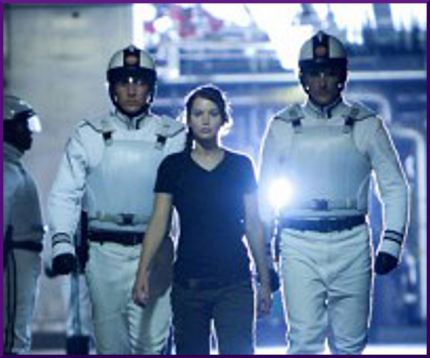After her 12-year-old sister Prim is drafted, chosen as a Hunger Games “tribute” in a lottery that, like the Vietnam draft, exempts the rich and privileged, Katniss volunteers to take her place. She, and a local boy named Peta are put on Panem’s high-speed rail system, and sent to the capital. They and the 22 other “tributes” are given a few days of basic training, paraded like show dogs, then sent into a large, open air arena, where they have to forage for food and kill one another for the entrainment of the city’s elite. Katniss, who is a master hunter and outdoor survivor, skills she learned poaching food in the woods outside District 12, and Peta, who, years before, had taken a beating stealing food for her family, prevail. They kill the other 22 tributes and “win.”
