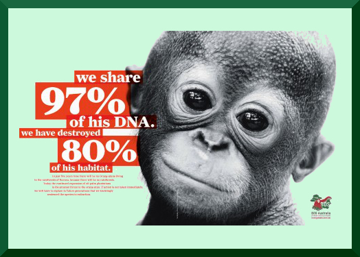 By purchasing products that contain crude palm oil, you are helping destroy ancient, pristine rainforest, wipe out species like the orangutan, and create a large-scale ecological disaster. Think of the consequences next time you do your weekly shopping; the consequences not only for orangutans and other animals, but for us as the human race; for we cannot survive without the rainforests either. We have a choice, orangutans do not. (Via)