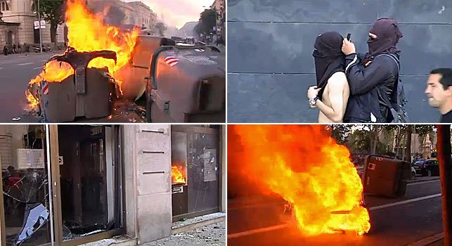 The united anti-capitalist Mayday march in Barcelona was cancelled half way through when the black block of the anarchist section began attacking banks and burning a rubbish container barricade.