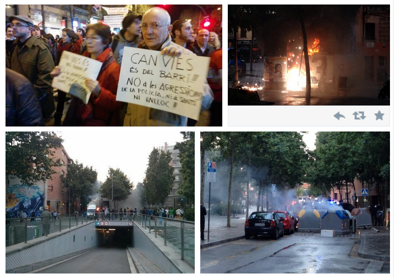 Various more columns arrived after incidents.. in Horta – Guinardo barrio for example has a van of Transport Barcelona was burned… in Poble Sec and St. Andreu -200 people cut three lanes of Gran Via and Meridiana highways respectively , overturning some containers .