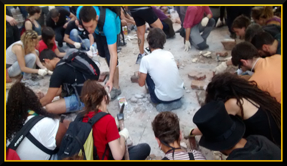 With no police a carnival atmosphere quickly developed, but the Can Vies collectives really were beginning to rebuild, a tractor of cement arrived and we were given tools to prepare bricks for re-laying.