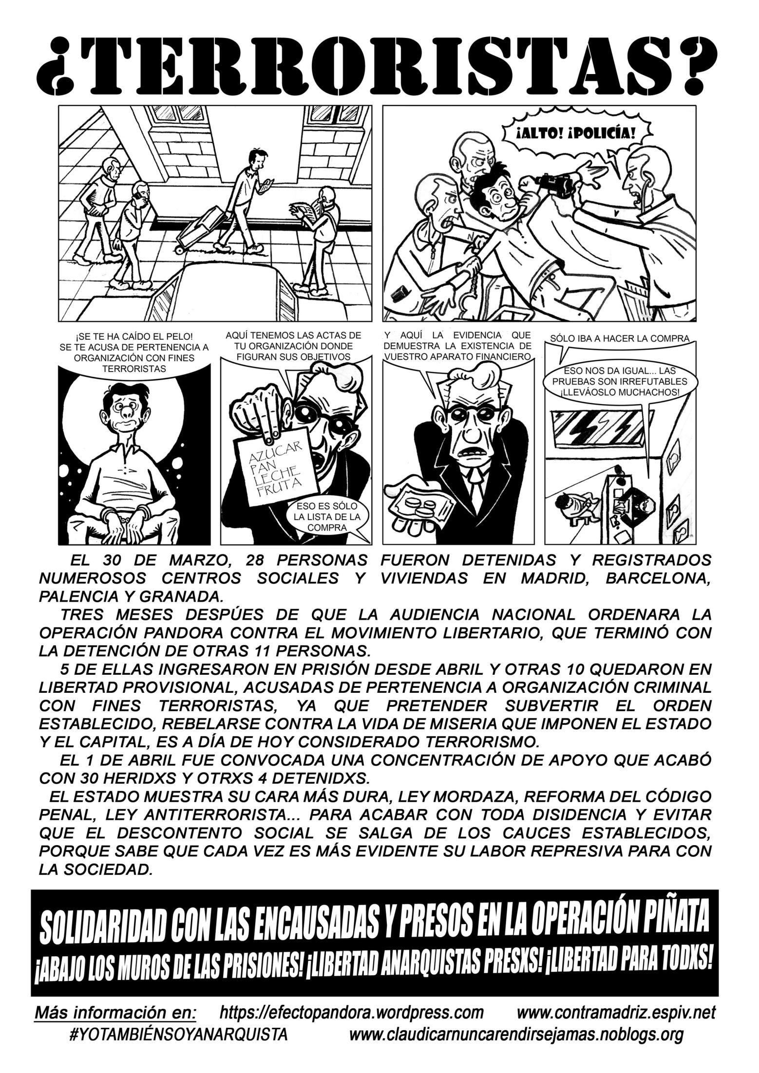 All the arrested in the Pandora and Piñata raids were related to two anarchists awaiting trial for allegedly bombing a church! The ruling Spanish right , highly infiltrated by Opus Dei, are still furious about this little bomb which hurt nobody as the claim referred to the mega crimes of the church in aiding the fascist dictatorship (eg handing thousands of anarchists to the State death squads). Many of the arrested anarchists were accused of being in a prisoners support group for the two, Fransicso and Monica. The campaign for their release continues with hope after the Piñata raids seem to be falling apart.