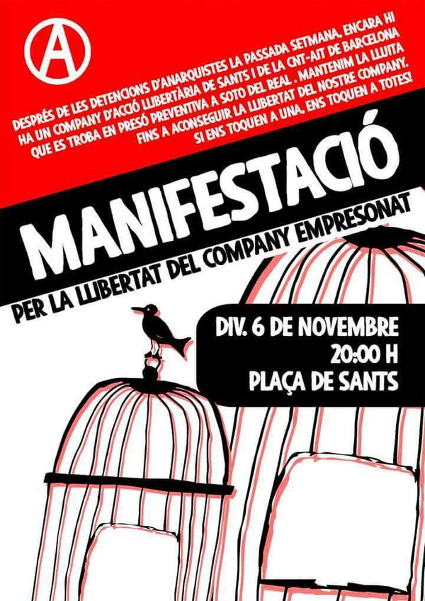 Judge Juan Pablo Gonzalez, after analyzing the documentation prepared by the Catalan police orders release under a bail of 8,000 euros of Enrique Costoya, a neighbor of Sants barrio in Barcelona, and a CNT labor lawyer and activist anarchist jailed on 30th October.