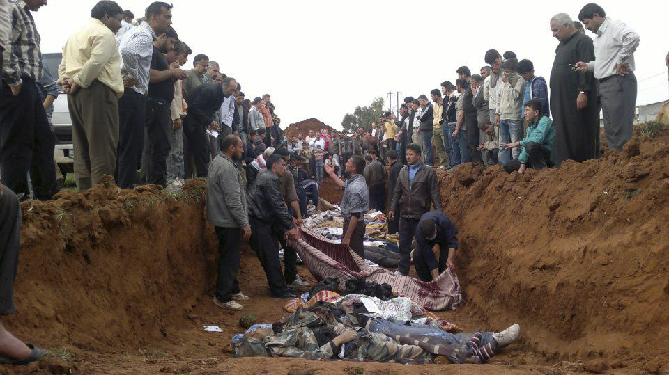 This citizen journalist image obtained by the Associated Press on Friday, April 6, 2012, shows a mass burial of people allegedly killed in recent shelling in Taftanaz, Syria. (AP Photo) THE ASSOCIATED PRESS CANNOT INDEPENDENTLY VERIFY THE CONTENT, DATE, LOCATION OR AUTHENTICITY OF THIS MATERIAL