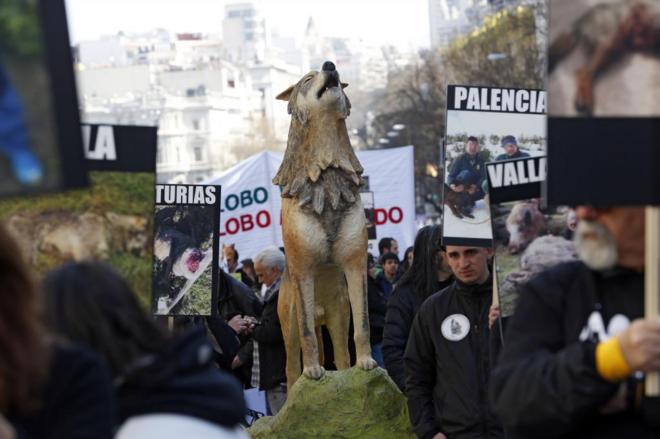 Hay más de un millón de cazadores licenciados en España .. y la mayoría de ellos les gustaría matar un lobo. Pero la semana pasada más de 10.000 personas se manifestaron en Madrid exigiendo más protección para los lobos, era la mayor manifestación en la historia en favor de una especie y el medio ambiente ..La ley vigente da una protección mínima y la compensación por las pérdidas de ganado.