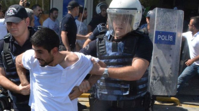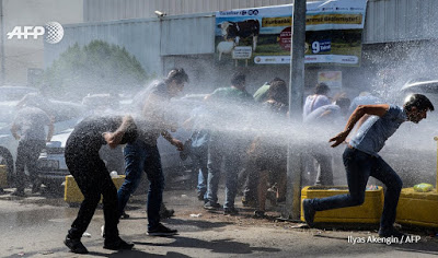 Erdogan`s agents attacked the unarmed demonstrators first with water cannons and then arrested them for protesting against their sackings, under the illogical pretext that they belonged to the left wing union KESK.