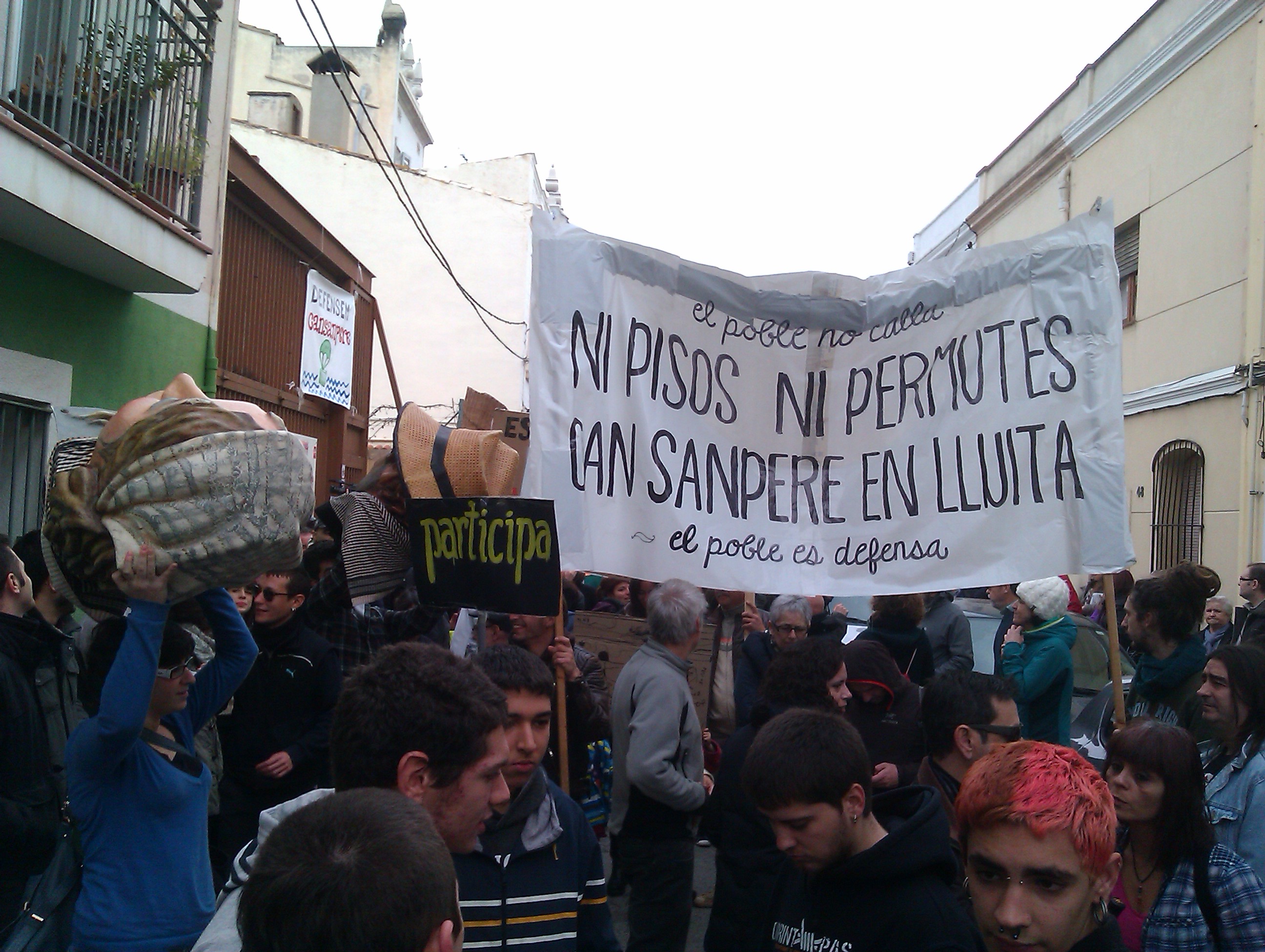 Travessem el barri. Avui el rebombori és evident. Són les vuit del vespre d’un dijous, pocs dies després que els membres de l’assemblea del Centre Social Autogestionat Can Sanpere rebessin la notícia del desallotjament.