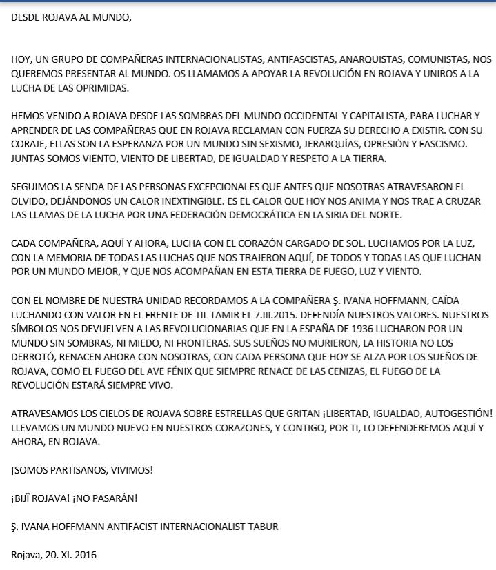 “Hoy, un grupo de antifascistas, internacionalistas, anarquistas, comunistas, socialistas y libertarios apelan al apoyo a la revolución de Rojava y, por tanto, a la lucha de los oprimidos. Venimos de la sombra del mundo capitalista occidental para luchar y aprender de nuestros camaradas de Rojava cómo reclamar la libertad y el derecho a existir. Con su coraje esperamos crear una vida sin opresión y persecución, un mundo sin fascismo y oscurantismo. Nos dirigimos hacia este objetivo empujados por los vientos de la libertad, la igualdad y el respeto por la Tierra. Este es el camino de aquellas personas excepcionales que han navegado hacia el olvido dejando un calor insaciable dentro de nuestros corazones. Es la misma calidez que ahora sentimos, que nos anima, que nos condujo a través del umbral de las llamas de la lucha de la Federación Democrática de Rojava.