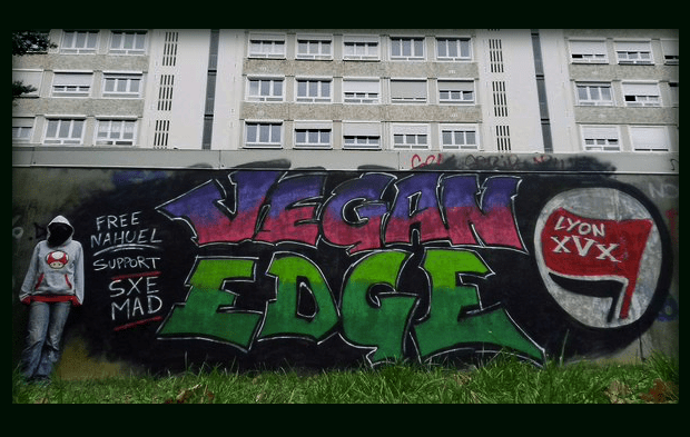 Lyon: Graffiti en apoyo al presx anarcovegano Nahuel, detenido en Madrid por sus actividades políticas #StraightEdge Anarcofeminismoenpdf, Ecoanarquismo en pdf,