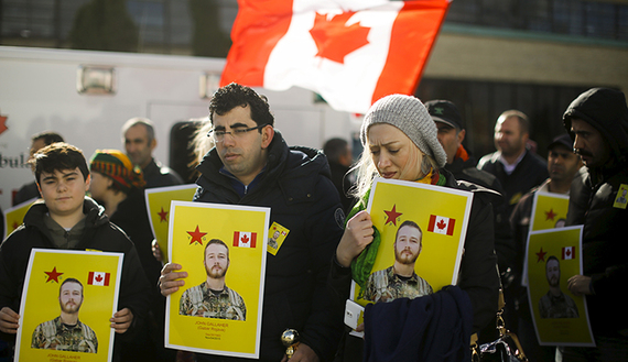 Members of the Kurdish community hold pictures of John Gallagher, a Canadian volunteer fighter and former Canadian forces member who was killed fighting alongside Kurdish forces in Syria against the Islamic State, in Toronto, November 20, 2015. REUTERS/Mark Blinch –