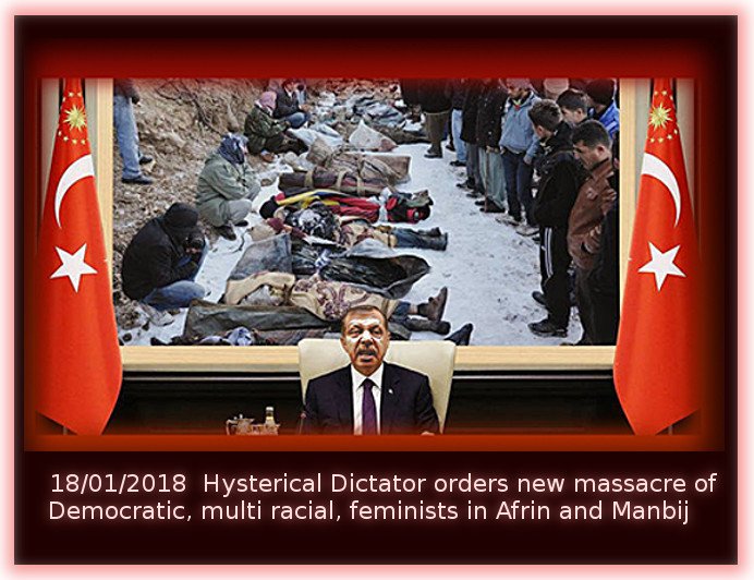 Comrades, we need your help more than everything. Its a life or death situation. This invasion isnt only about Afrin nor Rojava/Assyria/N. Syria but Erdogan wants to invade also the whole border territory, including Iraq’s Ezidistan (Zoroaster Kurdish lands /Sinjar), Ninewah (Iraqi Assyria), Turkmeneli (Iraqi Shia Turkomans) and Iraqi Kurdistan’s Qandil mountains area (PKK’s HQ and dissidents and oppressed people’s refugee villages and camps). Its clearly IMPERIALISM and he wants to destroy everything and massacre every people he just hate.