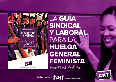 The CNT is also actively supporting the Feminist General Strike and has produced a booklet: ”With this guide we want to sort out the many misunderstandings that are being created in relation to the general feminist strike of March 8. Our informative guide clarifies the doubts that arise to the workers called to support the 24-hour strike”.