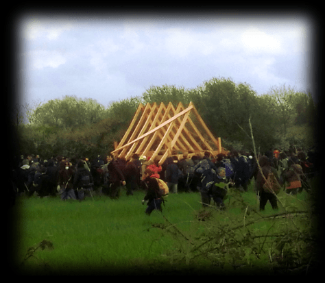 A mobile construction has been carried across the fields. Meanwhile more than a hundred people have been kettled since since this morning at the La Grée farm. Supporters are trying to reach them. We are informed that the Prefect [local representative of the state] has arrived at the Saulce crossroads.