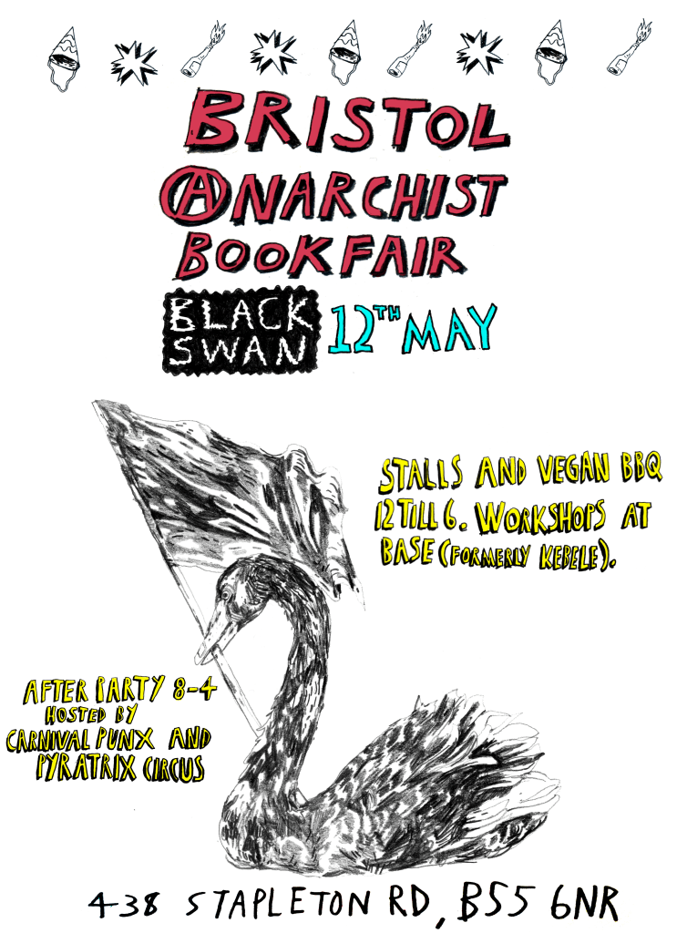 This Saturday, May 12th, is the Tenth Bristol Anarchist Bookfair! This year it’s taking place over two neighbouring venues, The Black Swan and BASE (formerly Kebele).