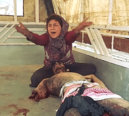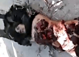 been pulled down, exposing her private parts. Her shirt is pulled upwards, but we don’t see her breasts since they have been cut off. A piece has also been cut from her abdomen. One of the soldiers tramples her body. The militants belong to the FSA, which along with ISIS controlled the area, as agents of the Turkish government, at the time of Kobani‘s killing and mutilation.