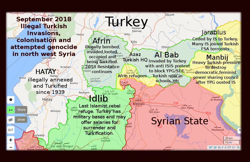 Local councils are run from Turkey, schools teaching Turkish, all with a far right wing Sunni Islam and extreme anti-women policy to counter the influence of the democratic and feminist Rojava Revolution .