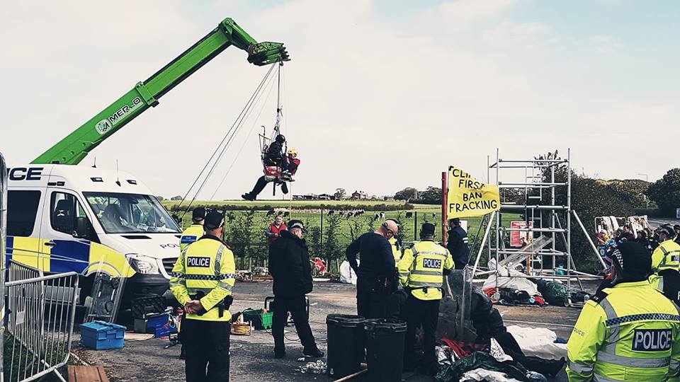 Protest outside Cuadrilla’s Preston New Road shale gas site, 2 October 2018. Photo: Eddie Thornton