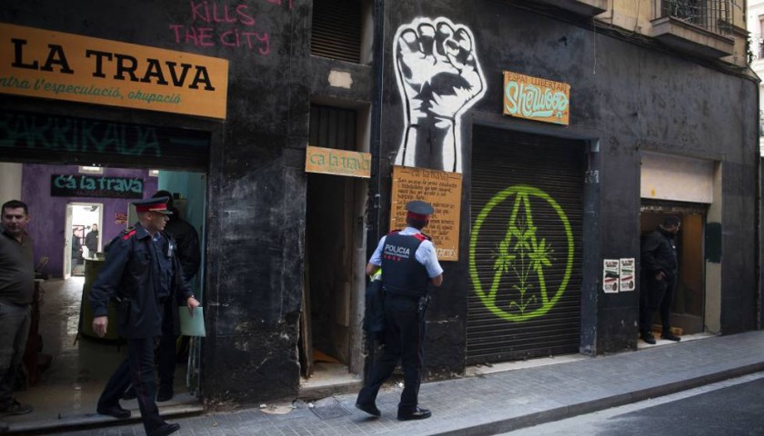 from La Directa At 7 am, the eviction of the Ca la Trava occupied center in the Gràcia neighborhood of Barcelona began. Early on, a helicopter was flying over the area and the Mossos Police deployed ten vans of the anti-riot unit.