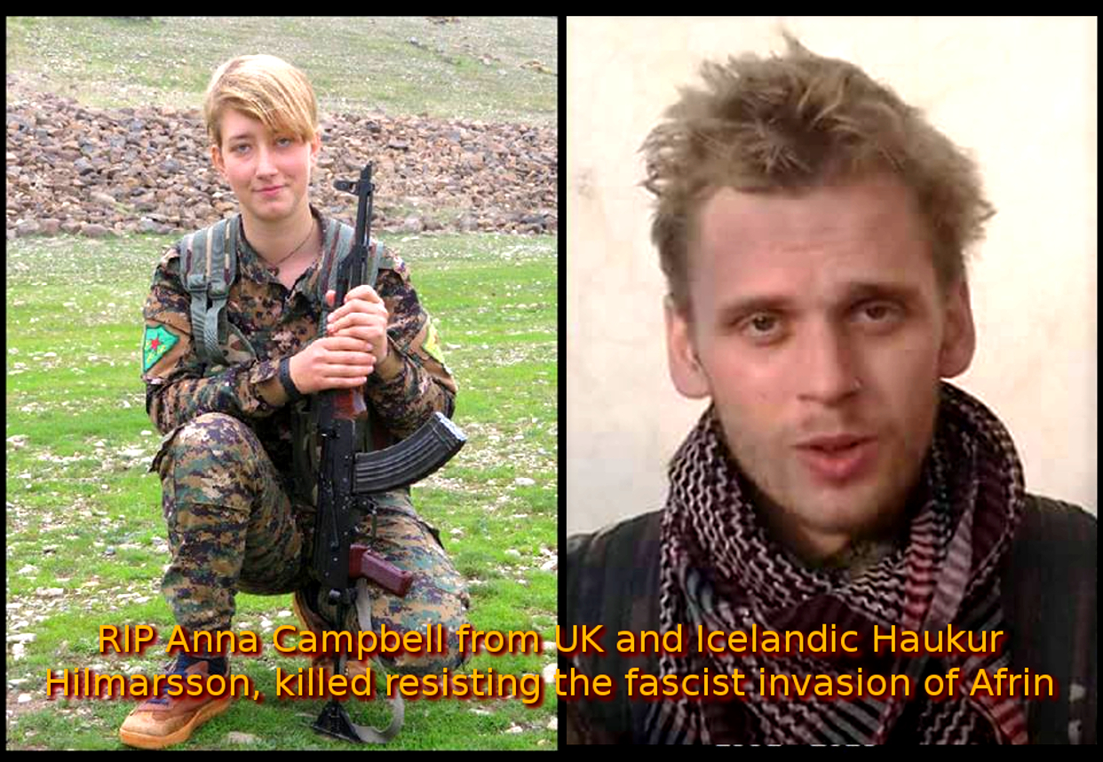 Erdogan ordered the illegal and genocidal invasion and Turkification of Afrin, killing, looting and exiling half the population. And murdering our comrades there to defend the democratic revolution, including Anna and Haukur , see photo above.