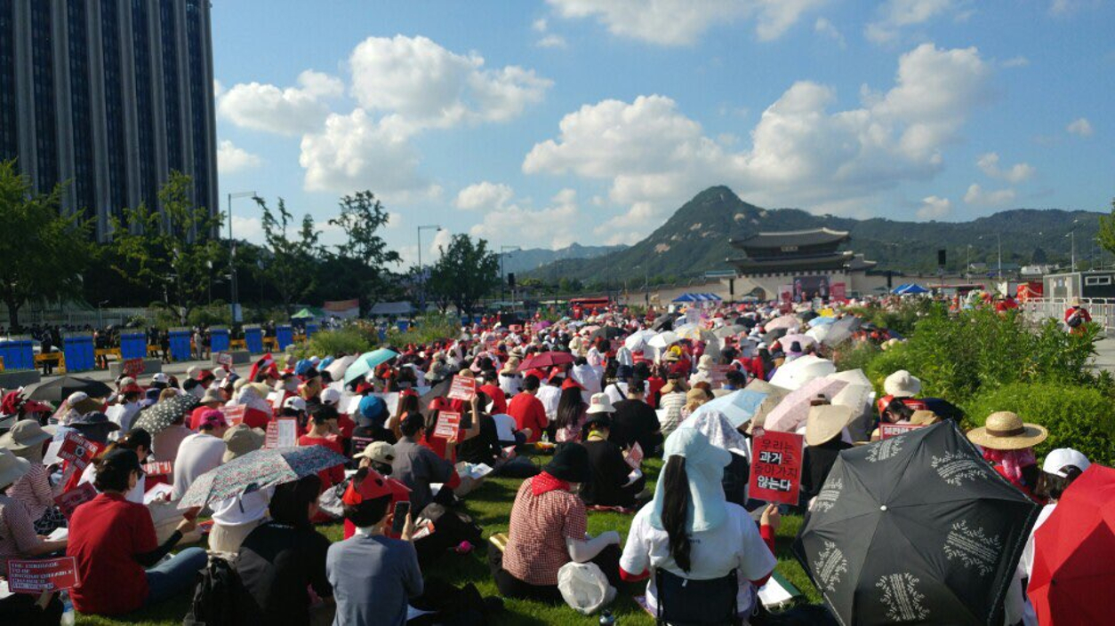 Journalists from around the world have been reporting on these large-scale women’s rights rallies, which have taken place almost every month since May. Chartered buses transport women from towns and cities all over the southern half of the Korean peninsula to attend.