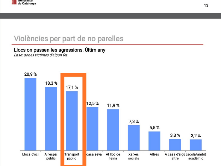 De hecho, la Encuesta de Violencia Machista en Catalunya 2016 señala que un 56% de las agresiones a mujeres por parte de hombres que no son pareja o expareja se produjeron mayoritariamente en lugares de ocio, al espacio público, o en transportes públicos.