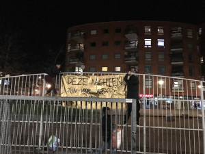 Last night a dozen anarchists made a walk through the Schilderswijk in Den Haag. Five banners were hung at different locations and flyers were spread with the title “Solidarity with those who revolt”.