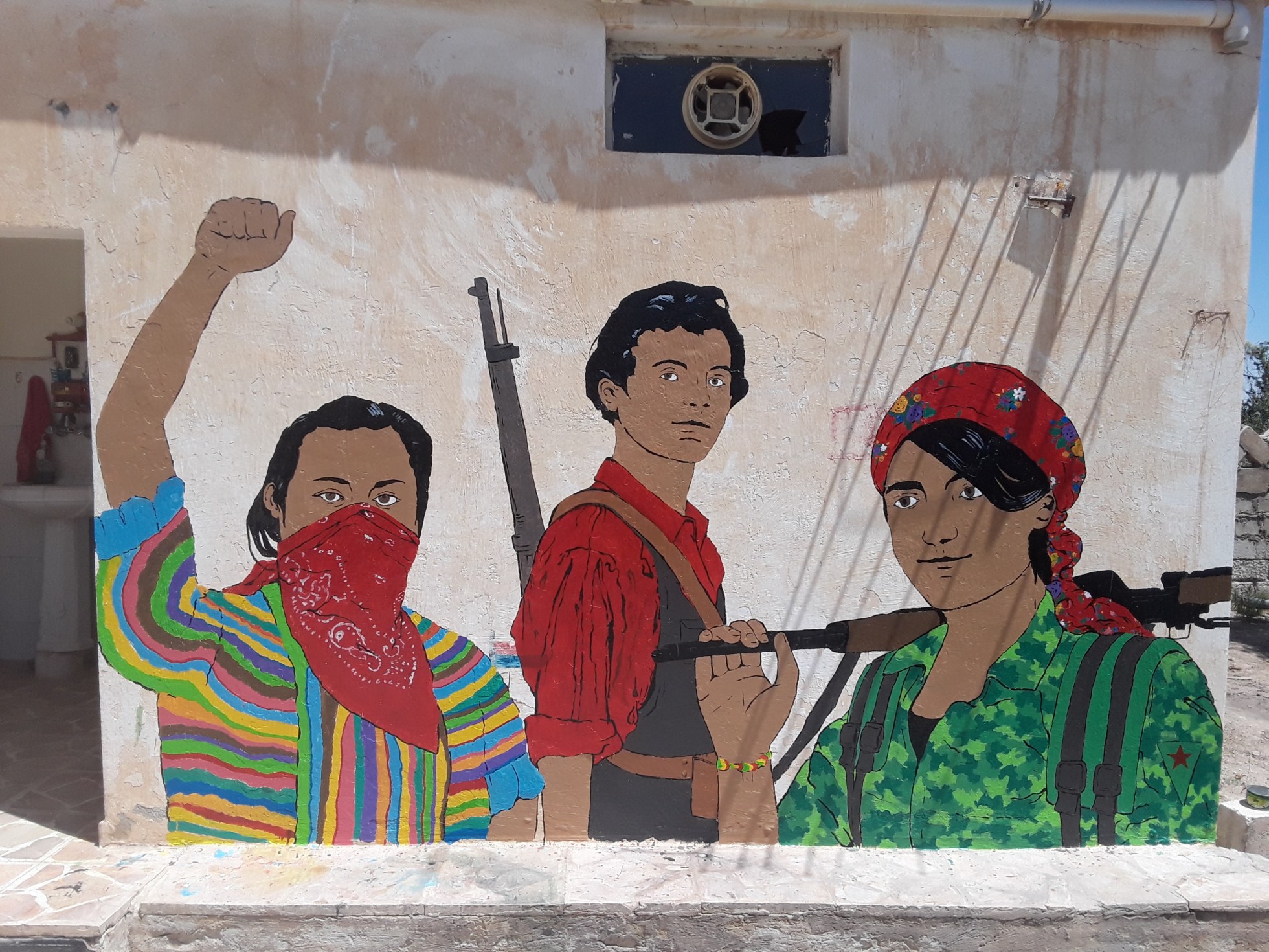 Here on the ground one clearly sees how makeshift this revolution is, the home-made tanks falling apart at the checkpoints, the derelict regime outposts repurposed as women’s centres, the meals and shelter constantly offered to us by poor villagers as we travel for our work, the cheaply-produced videos projected onto bedsheets reminding the local youth of their long history of struggle. And one sees that this hand-to-mouth existence is the source of its strength.