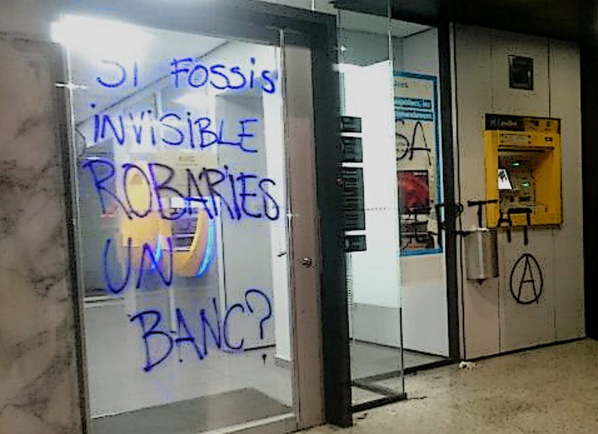 Estamos aquí para defender los sueños emancipadores ofensivos que rasguñan la manera de vivir que nos han impuesto. Estamos aquí porque en ningún caso, expropiar a quien roba masivamente a las que no tenemos nada, a quien desahucia, a quien destruye la tierra en beneficio de los lobbys, expulsándonos de nuestros pueblos y ciudades debería ser considerado delito, sino un acto poético de resistencia contra el máximo exponente del capitalismo violento; los bancos.