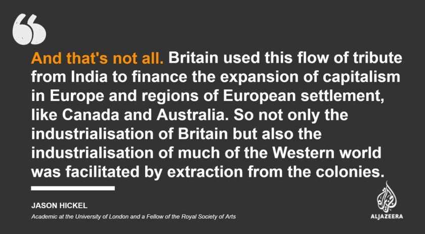 And that’s not all. Britain used this flow of tribute from India to finance the expansion of capitalism in Europe and regions of European settlement, like Canada and Australia. So not only the industrialisation of Britain but also the industrialisation of much of the Western world was facilitated by extraction from the colonies.