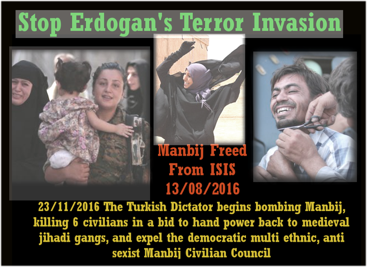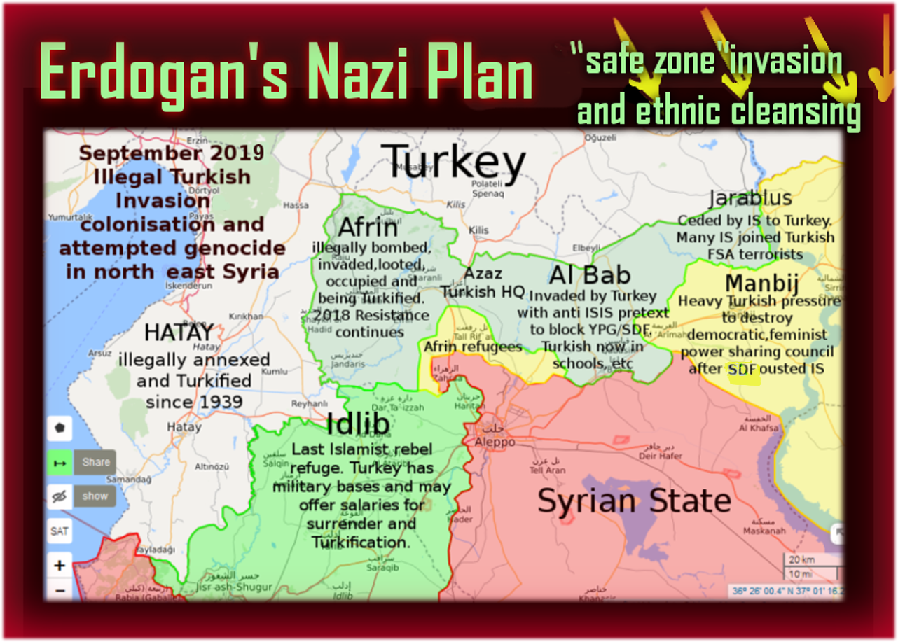 Erdogan has repeatedly vowed to recapture all lands once held by the Ottoman Empire, so all Syria ‘belongs to Turkey’ and promised to settle Turks and Arab refugees in Rojava, expel the local Kurdish population and end the unique democratic revolution which has united all races and creeds and freed women in the Rojava Revolution from centuries of serfdom, as illustrated in Kobane, and many Kurdish towns.