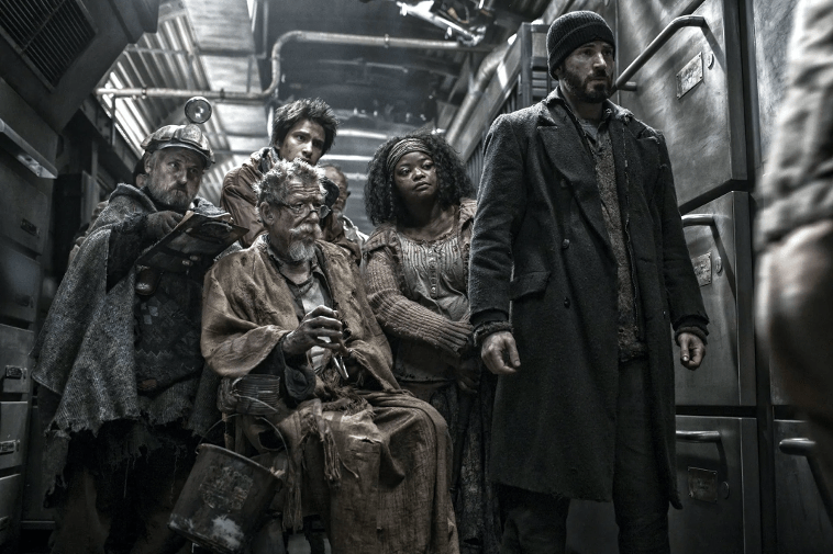 The film starts with the failed climate engineering ‘chemtrails’ and moves swiftly to the carriage where the tail-enders, led by Curtis and his second-in-command Edgar, are being overseen by armed militia. The atmosphere is Dickensian as the living quarters resemble slums from the Industrial Revolution. The dirty grey clothes, drawn faces and squalor are straight out of the documentary photography of the early twentieth century and resemble descriptions from Upton Sinclair’s extraordinary novel The Jungle (1906) of the meat-packing industry in Chicago.