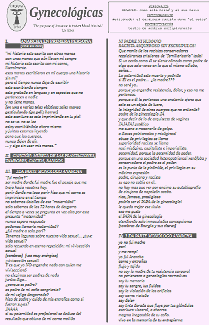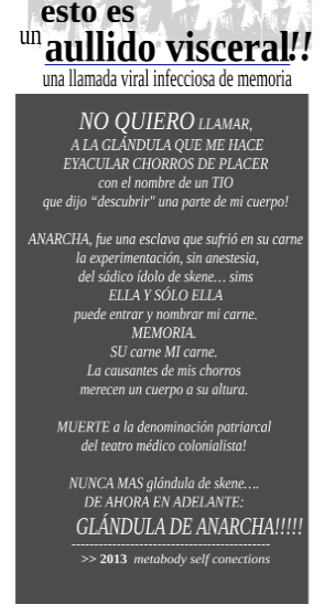 ELLA, Y SOLO ELLA, puede nombrar mi carne. MEMORIA. SU carne, MI carne. Lo que me hace chorros merece un cuerpo que pueda hablar a su nivel. ¡MUERTE a la dominación patriarcal del teatro médico colonialista!