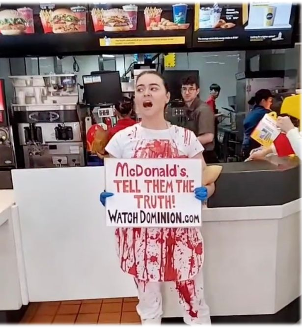 An animal activist has been filmed outside a McDonald’s restaurant in a blood-coloured outfit as part of a brave and original protest.